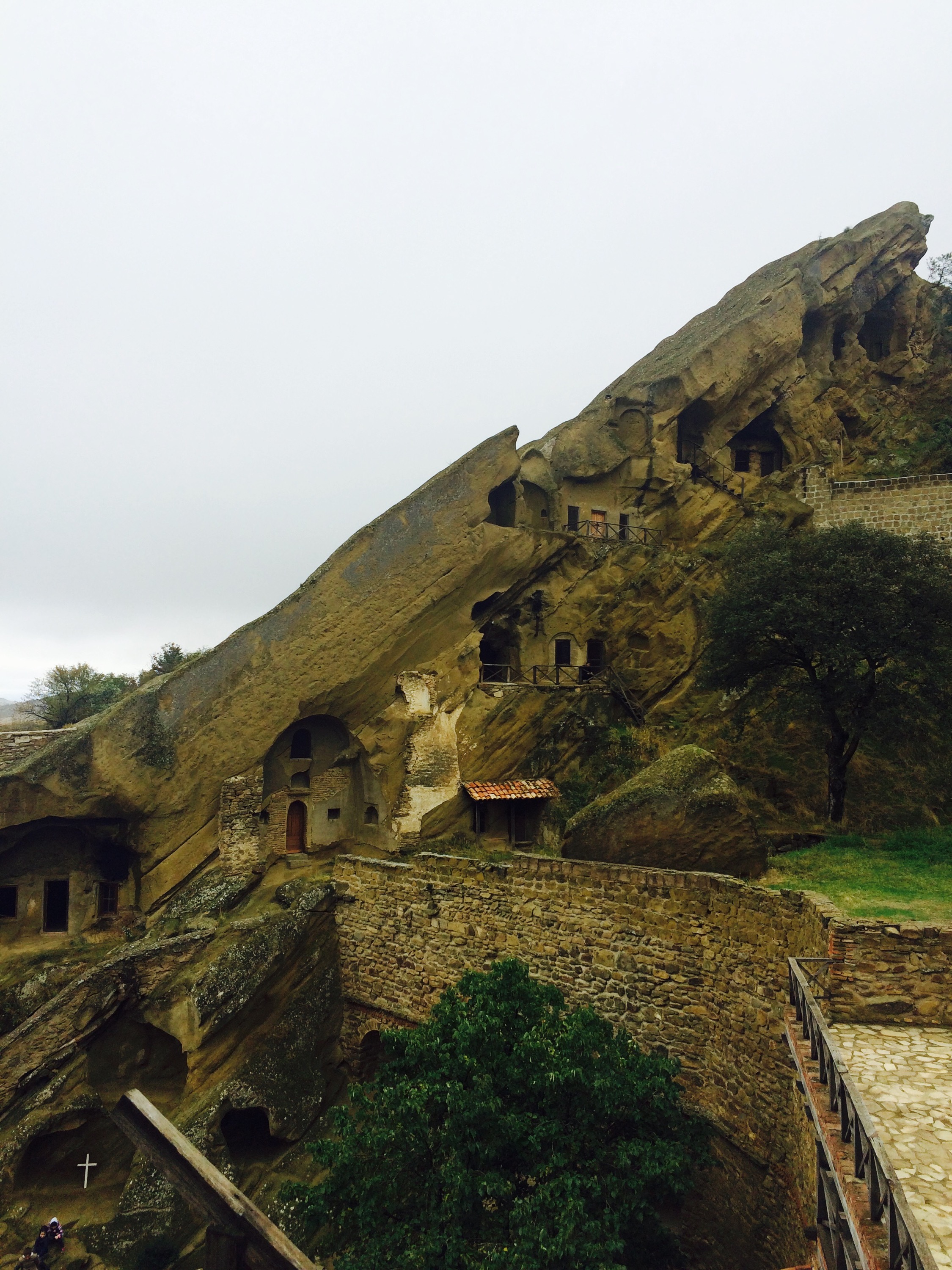 We walk up the muddy driveway to the monastery. A sheet of rock sprouts from the side of the hill at a 45 degree angle. On its side are the caves that have served as monks’ cells since the 6th century when St. Davit Garejeli founded the monastery. The structure casts its shadow on the courtyard and the modest sanctuary below. Though the sacred ground has been sacked, destroyed and defiled by Mongols, Persians and Soviets over the centuries, Georgian monks have returned here time and again to labor and pray.